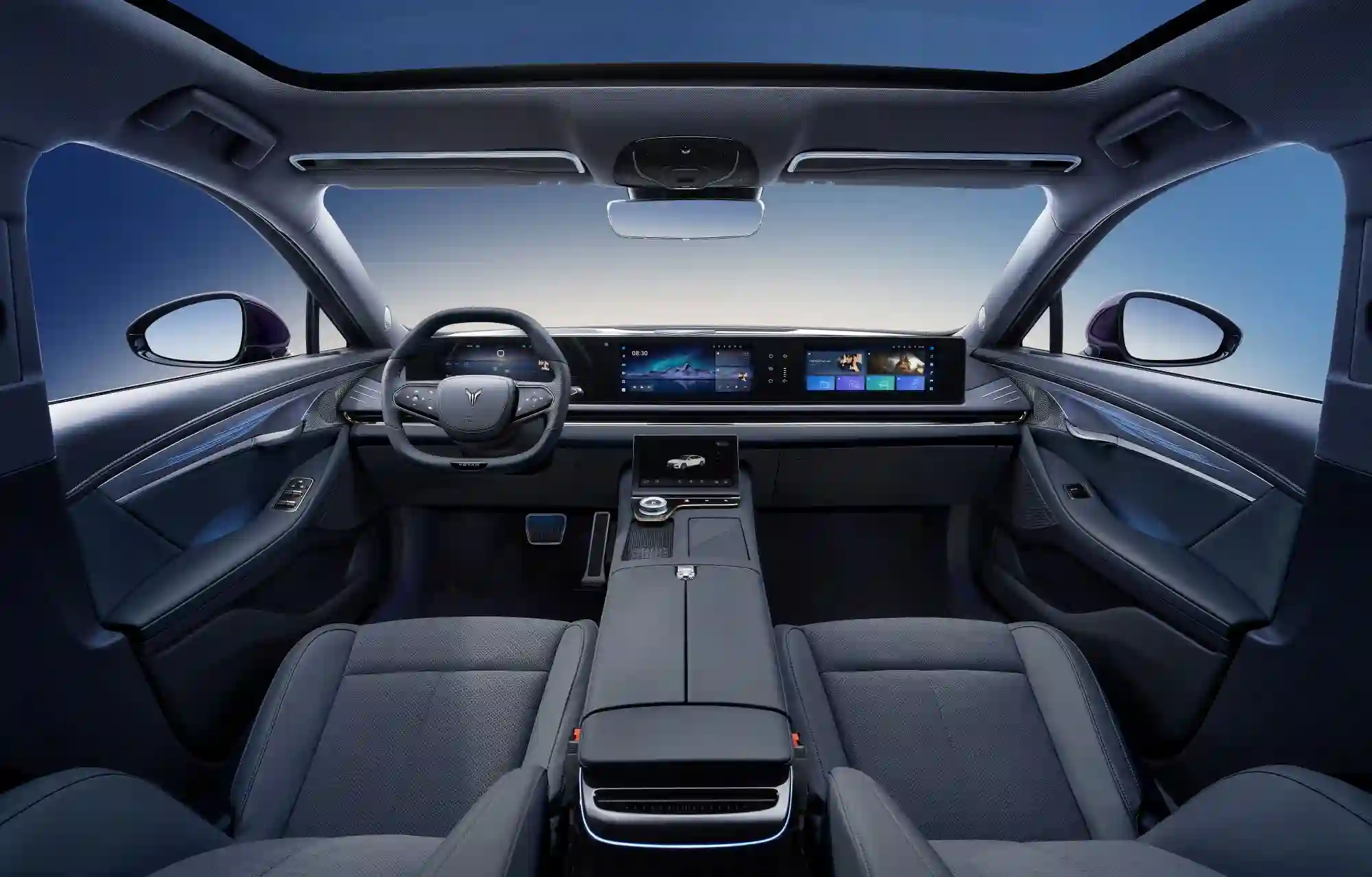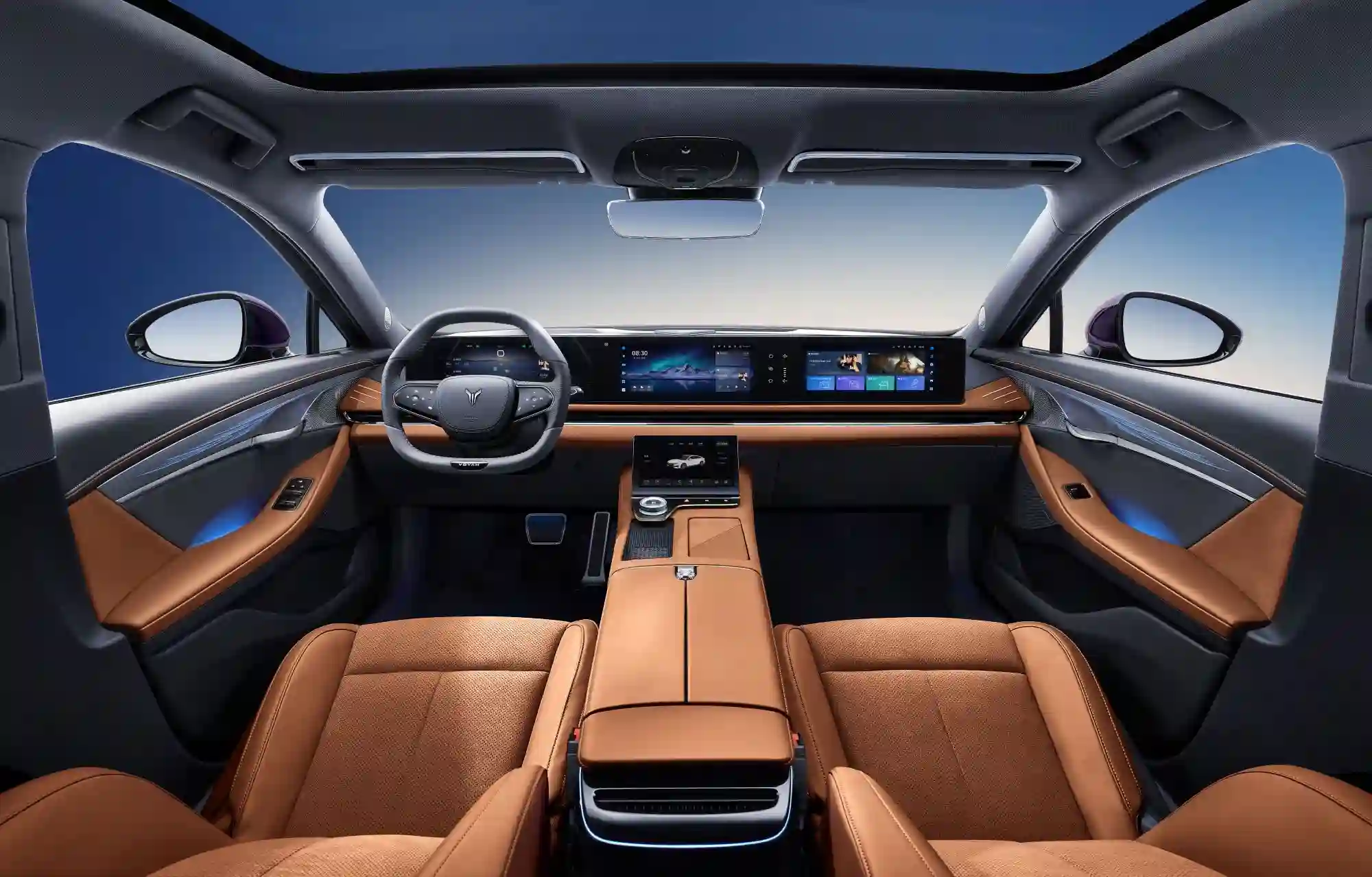 Салон VOYAH PASSION EVR доступен в двух цветовых комбинациях: черного с акцентными элементами серого и коричневого с акцентными элементами темно-серого оттенка.